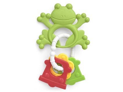 Farebné plastové hryzátko spojené s tromi navlečenými farebnými dielikmi a rôznymi geometrickými či zvieracími tvarmi. Táto hračka stimuluje zrak, hmat a motoriku dieťaťa, a zároveň prináša úľavu pri prerezávaní zúbkov. Je vyrobené z triednych, zdravotne nezávadných plastov, bez ostrých hrán...