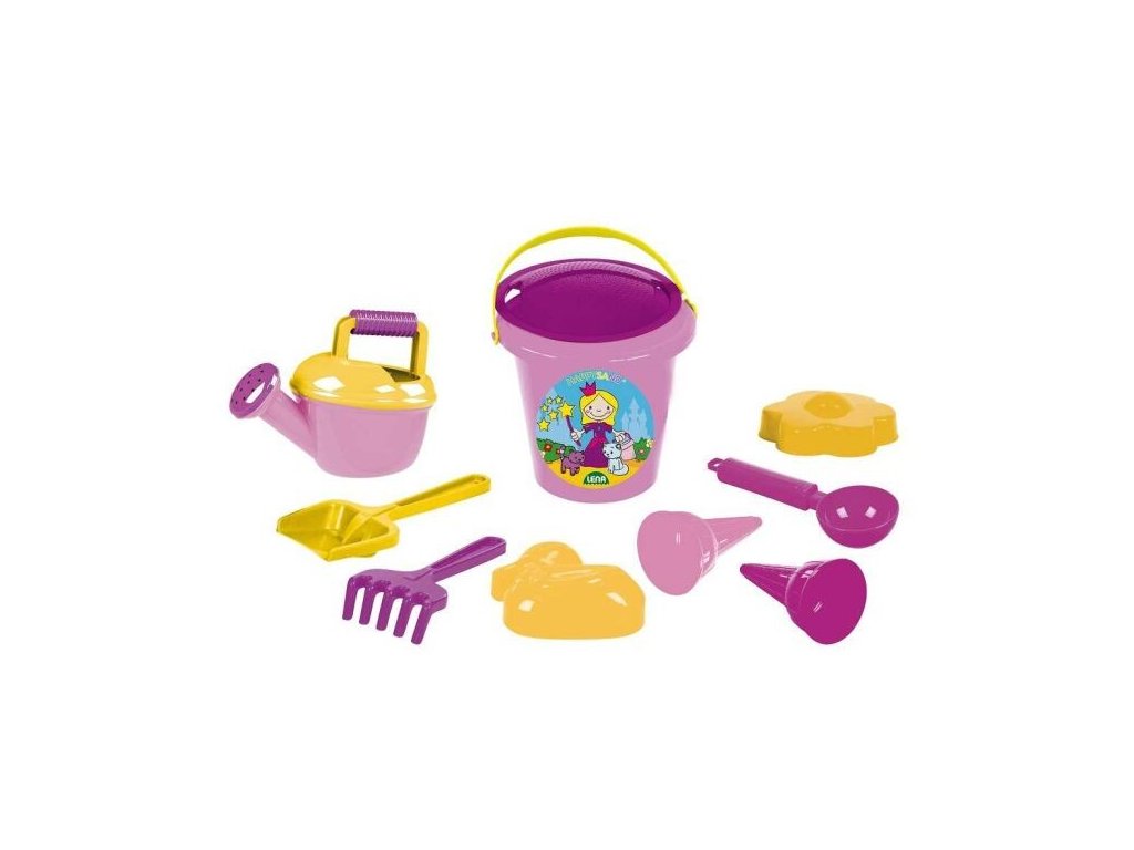 Sada obsahuje vedierko, lopatka, hrable, 2 formičky, sitko, kanvička, naberačka na zmrzlinu, 2× kornútky na zmrzlinu.