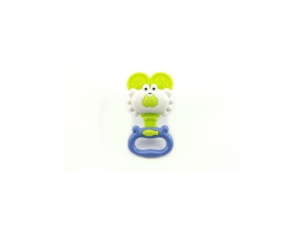 Pri prvom uchopení a jemnom zatrasení chrastítka zaujme dieťa svetlé farby a jemný zvuk hrkania, ktorý stimuluje sluch a pohybové reakcie.