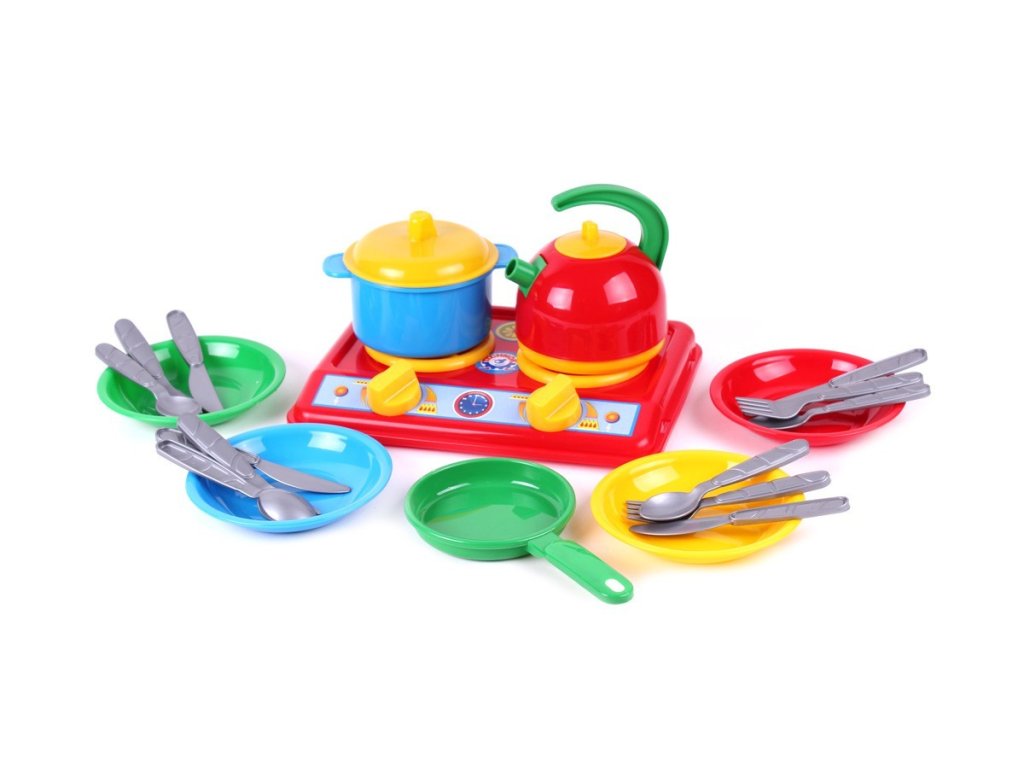 Sada obsahuje dvojplatnička, 4 taniere s príbory, hrniec s podličkou a kanvicu.